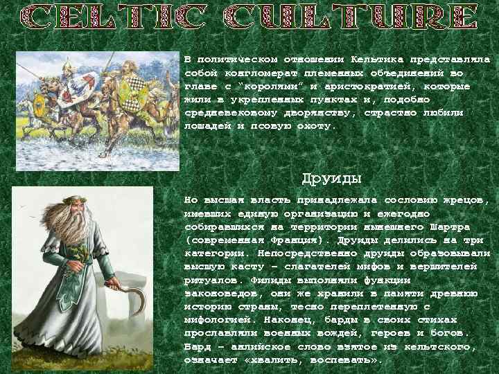 В политическом отношении Кельтика представляла собой конгломерат племенных объединений во главе с “королями” и аристократией, которые жили в укрепленных пунктах и, подобно средневековому дворянству, страстно любили лошадей и псовую охоту. Друиды Но высшая власть принадлежала сословию жрецов, имевших единую организацию и ежегодно собиравшихся на территории нынешнего Шартра (современная Франция). Друиды делились на три категории. Непосредственно друиды образовывали высшую касту – слагателей мифов и вершителей ритуалов. Филиды выполняли функции законоведов, они же хранили в памяти древнюю историю страны, тесно переплетенную с мифологией. Наконец, барды в своих стихах прославляли военных вождей, героев и богов. Бард – анлийское слово взятое из кельтского, означает «хвалить, воспевать» .