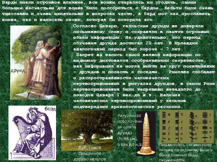 Барды имели огромное влияние, все воины старались им угодить, самым большим несчастьем для воина было поссориться с бардом. Кельты были очень тщеславны и очень щепетильны в вопросах чести, а бард мог как прославить воина, так и написать песню, которая бы позорила его. Согласно Цезарю, галльские друиды не доверяли письменному слову и сохраняли в памяти огромный обьём информации. Не удивительно, что период обучения друида достигал 20 лет. В Ирландии аналогичный период был короче – 7 лет. Запрет на запись самой важной информации повидимому диктовался соображениями секретности, так информация не могла выйти за круг посвящённых друид – друидов и попасть к соседям. Римляне сообщают о распространённости человеческих жертвоприношений в ритуалах друидов, в самом Риме жертвоприношения были запрещены незадолго до походов Цезаря 1 век до н. э. . Наличие человеческих жертвоприношений у кельтов подтверждают археологические раскопки. бард Дуб, самое священное дерево кельтов Ритуальная позолоченн ая шляпа друида (h=88 см), 6 век до н. э. Письменность – огамическое письмо, по-видимому были и более сложные виды письменности.