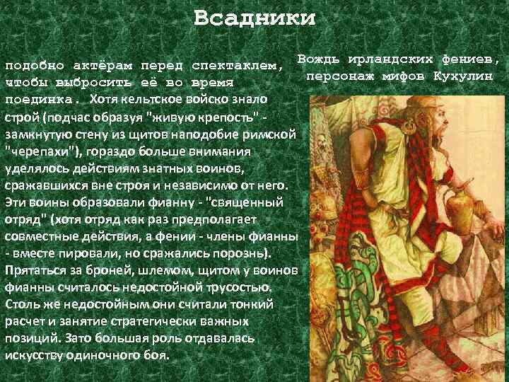 Всадники подобно актёрам перед спектаклем, Вождь ирландских фениев, персонаж мифов Кухулин чтобы выбросить её во время поединка. Хотя кельтское войско знало строй (подчас образуя "живую крепость" замкнутую стену из щитов наподобие римской "черепахи"), гораздо больше внимания уделялось действиям знатных воинов, сражавшихся вне строя и независимо от него. Эти воины образовали фианну - "священный отряд" (хотя отряд как раз предполагает совместные действия, а фении - члены фианны - вместе пировали, но сражались порознь). Прятаться за броней, шлемом, щитом у воинов фианны считалось недостойной трусостью. Столь же недостойным они считали тонкий расчет и занятие стратегически важных позиций. Зато большая роль отдавалась искусству одиночного боя.