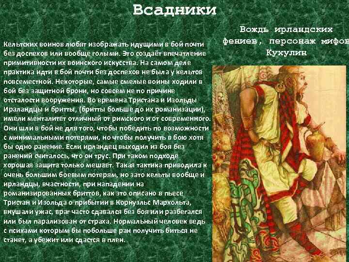 Всадники Кельтских воинов любят изображать идущими в бой почти без доспехов или вообще голыми. Это создаёт впечатление примитивности их воинского искусства. На самом деле практика идти в бой почти без доспехов не была у кельтов повсеместной. Некоторые, самые смелые воины ходили в бой без защитной брони, но совсем не по причине отсталости вооружения. Во времена Тристана и Изольды Ираландцы и бритты, (бритты больше до их романизации), имели менталитет отличный от римского и от современного. Они шли в бой не для того, чтобы победить по возможности с минимальными потерями, но чтобы получить в бою хотя бы одно ранение. Если ирландец выходил из боя без ранений считалось, что он трус. При таком подходе хорошая защита только мешает. Такая тактика приводила к очень большим боевым потерям, но зато кельты вообще и ирландцы, вчастности, при нападении на романизированных бриттов, как это описано в пьесе Тристан и Изольда о прибытии в Корнуэльс Мархольта, внушали ужас, враг часто сдавался без боя или разбегался или был парализован от страха. Нормальный человек ведь с психами которым бы побольше ран получить биться не станет, а убежит или сдастся в плен. Вождь ирландских фениев, персонаж мифов Кухулин