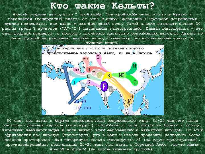 Кто такие Кельты? Анализ родства народов по Y хромосоме. Эта хромосома есть только у мужчин и передаётся (копируется) всегда от отца к сыну. Сравнение Y хромосом современных мужчин показывает, как давно у них был общий отец. Такой анализ выделяет больше 20 разных групп Y хромосом (“A”-”T”) называемых гаплогруппами. Каждая гаплогруппа – это один древний пранарод от которого произошло несколько современных народов. Анализ по гаплогруппам не учитывает женский вклад в генетику, но наследование только по мужской линии. На карте для простоты показано только происхождение народов в Азии, но не в Европе 25 -35 тыс. лет 50 тыс. лет назад в Африке появились люди современного типа, 35 -25 тыс лет назад несколько древних народов (гаплогрупп) современного типа пришли из Африки в Европу, вытеснили неандертальцев и дали начало всем европейским и азиатских народам. От этих африканских про-народов (гаплогрупп) уже в Азии и Европе произошло несколько более молодых про-народов. Нас интересует только гаплогруппа R 1 (на карте ярко-красный), про-индоевропейцы, появившаяся 25 -20 тыс. лет назад в Середней Азии, где-то между Аралом и Ираном (на карте выделена красным).