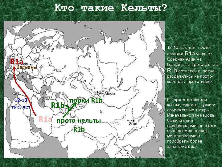 Кто такие Кельты? 12 -10 тыс. лет протославяне R 1 a ушли из Средней Азии на Балканы , а прото-кельты R 1 b остались и позже разделились на протокельтов и прото-тюрок. R 1 a балканы 12 -10 тыс. лет R 1 b тюрки R 1 b R 1 a прото-кельты R 1 b К тюркам относятся казахи, киргизы, турки и современные татары. Изначально эти народы были вполне европеоидами, но затем сильно смешались с монголоидами и приобрели более азиатский вид.