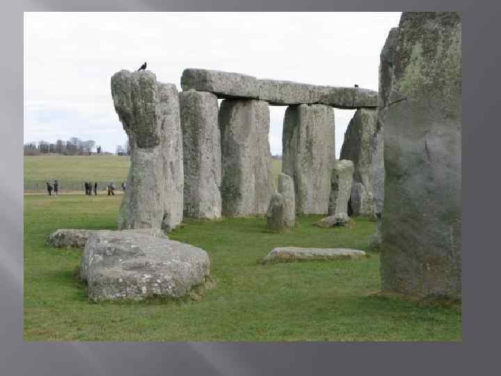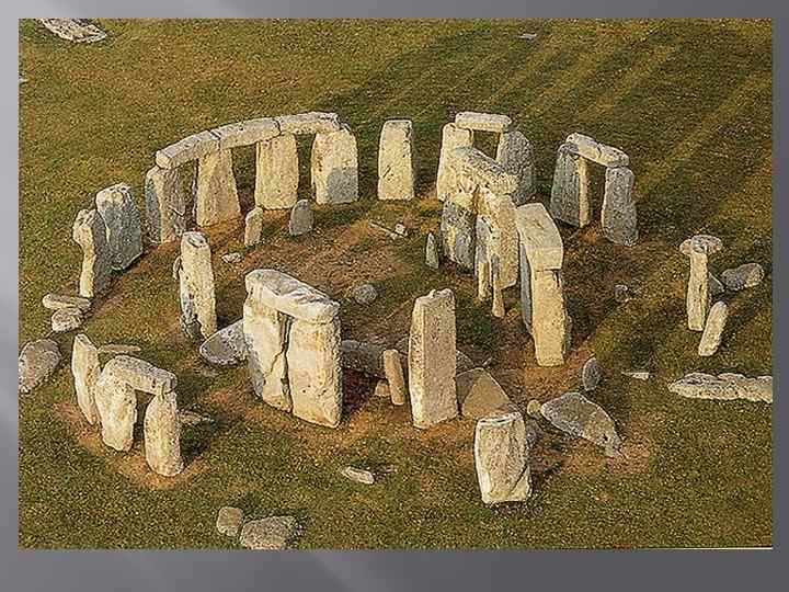 Стоунхендж I Стоунхендж – уникальный памятник, самое известное в Европе мегалитическое сооружение. В том виде, в каком он дошел до наших дней, создавался в течение примерно полутора тысяч лет. Назначение таких структурных сооруженицй, какими являются британские хенджи, не вполне понятно. Общей чертой между Стоунхенджем и ближайшим к нему Эйвбери, Даррингтонскими стенами и другими является только кольцевой ров и вал, возведенный по обе стороны или только с внешней стороны рва, что свидетельствует о его вторичной роли, ибо функциональное назначение выполнял только вал, а ров служил лишь для выемки необходимого для его возведения грунта. Эта начальная стадия возведения святилища на месте будущего Стоунхенджа (название Стоунхендж означает в переводе с англосаксонского «Висящие камни» , а их в ту пору еще не было) датируется периодом около 3200 года до н. э.