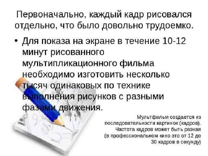 Рисованная мультипликация Схема создания традиционной мультипликации В технологию традиционной рисованной мультипликации входит наложение и сведение в один кадр прозрачных листов с нарисованными на них персонажами; при необходимости изобразить движение одного персонажа рисуется он сам и кадр собирается с заменённой деталью, вместо того, чтобы рисовать всю картину с изменением целиком. Выделяется своеобразием силуэтная анимация, наиболее крупными представителями которой являются Лотта Райнигер и Энтони Лукас.
