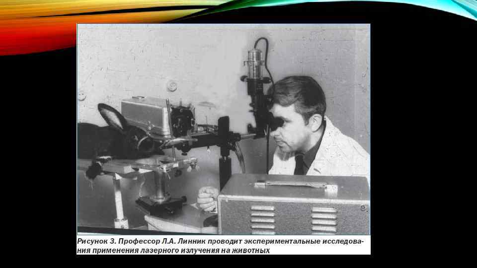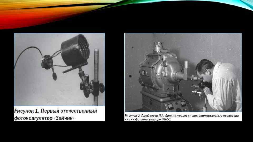 • Леонидом Андреевичем Линником под руководством Владимира Петровича Филатова в 1954 г. был разработан первый отечественный фотокоагулятор «Зайчик» , что явилось первым шагом в приоритетном развитии отечественной лазерной офтальмологии. • Через 2 года был изготовлен офтальмологический фотокоагулятор ФКС-1, который прошел апробацию в экспериментах на кроликах и затем стал применяться в клинике. • Профессор Линник Леонид Андреевич в 1963 году впервые в мире осуществил успешную лазерную коагуляцию сетчатки человека.