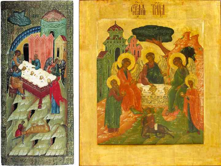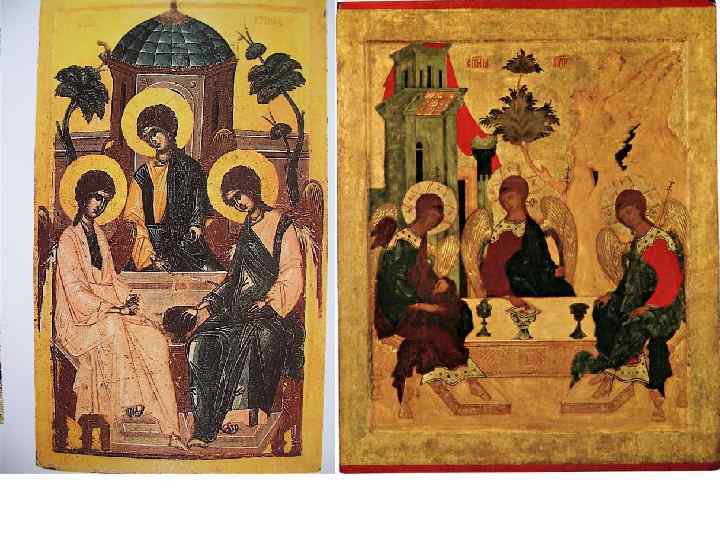 Иконопись "Троица" Андрея Рублёва - шедевр древнерусской живописи. Непривычно выглядят непараллельные линии, которые не сводились в центр картины, а как бы исходили из точки перед картиной. При создании «Троицы» Андрей Рублев использует как обратную перспективу, так и аксонометрию.
