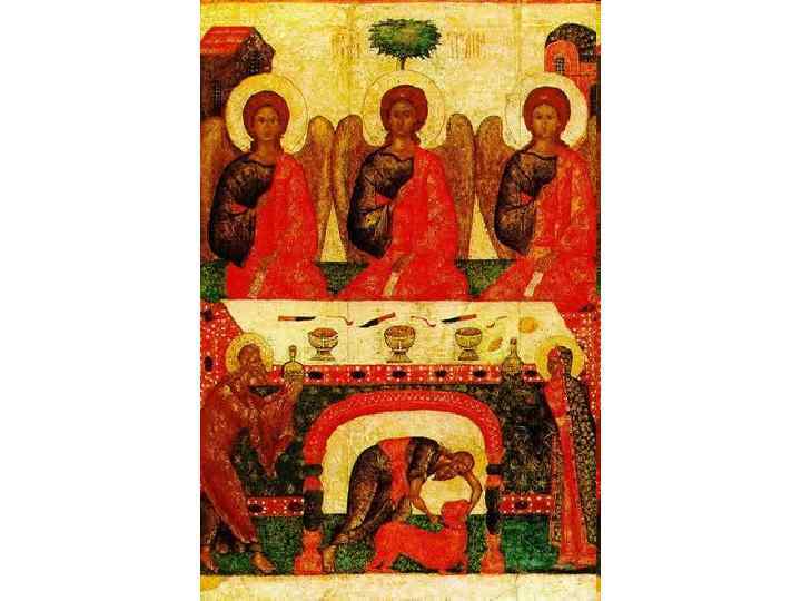 И явился ему Господь у дубравы Мамре, когда он сидел при входе в шатер, во время зноя дневного. Он возвел очи свои и взглянул, и вот, три мужа стоят против него. Увидев, он побежал навстречу им от входа в шатер и поклонился до земли, и сказал: Владыка! если я обрел благоволение пред очами Твоими, не пройди мимо раба Твоего; и принесут немного воды, и омоют ноги ваши; и отдохните под сим деревом, а я принесу хлеба, и вы подкрепите сердца ваши; потом пойдите; так как вы идете мимо раба вашего. Они сказали: сделай так, как говоришь. И поспешил Авраам в шатер к Сарре и сказал: поскорее замеси три саты лучшей муки и сделай пресные хлебы. И побежал Авраам к стаду, и взял теленка нежного и хорошего, и дал отроку, и тот поспешил приготовить его. И взял масла и молока и теленка приготовленного, и поставил перед ними, а сам стоял подле них под деревом. И они ели (Бытие 18: 1 -8). Самое ранее изображение сцены Гостеприимства Авраама. Катакомбы под Виа Латина, ок. 350 г.