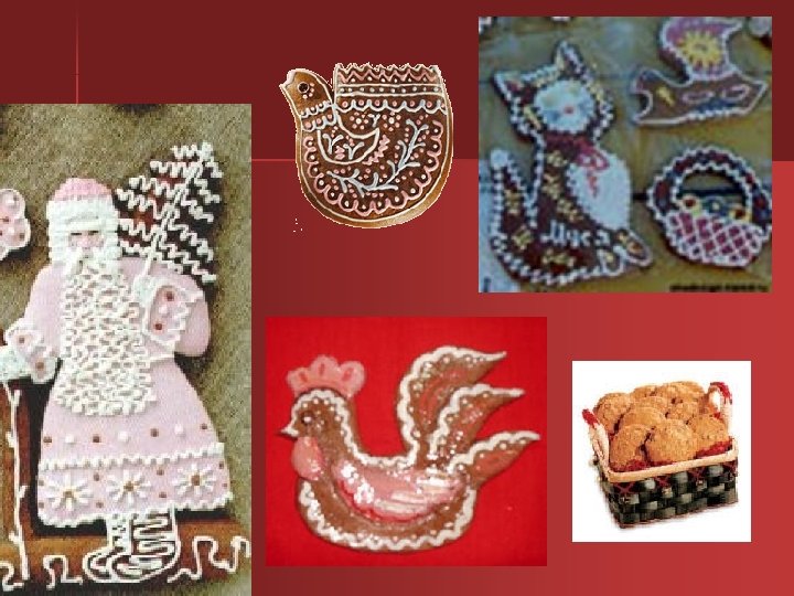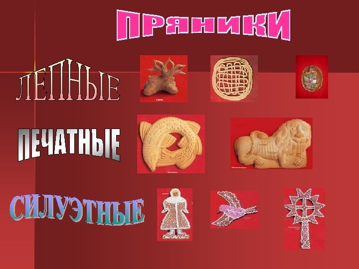 Для детей выпекались небольшие пряники в форме домашних животных, птиц, зверей, с традиционными новогодними сюжетами, в подарок невесте и молодой даме дарили пряник в виде корзины цветов, сердечка, целующихся голубков, лебедей, павлинов с соответствующими случаю надписями: «Знак любви» , «Знак верности» , «Знак памяти» , «Знак дружбы» , «Кого люблю, тому дарю» , «В день ангела» .