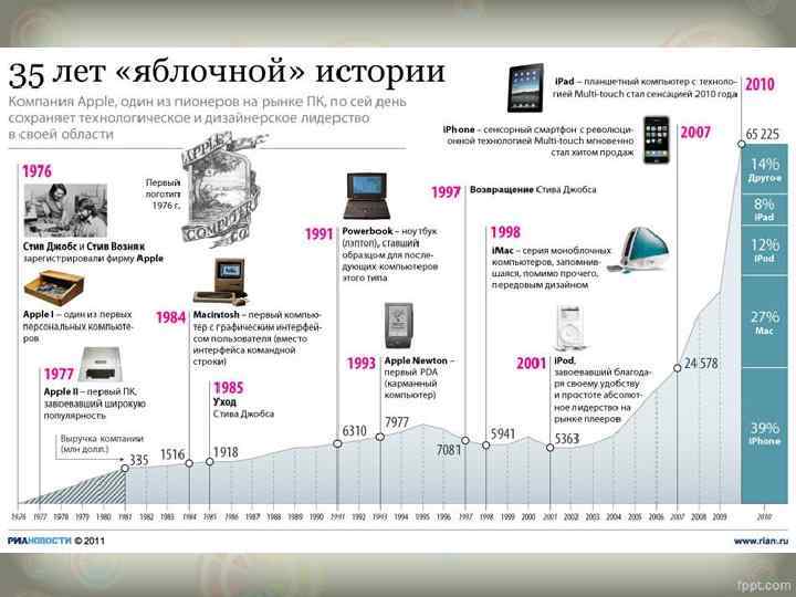 Покажите мне того человека, кто не слышал про компанию Apple. Бросившие вызов IBM и переплюнувшие Microsoft, они смогли вызвать настоящий фурор в компьютерном мире, и не один раз перевернуть представление всего человечества, насчет вычислительных машин и передовых информационных технологий. Кого может удивить тот факт, что Apple является самым дорогим брендом на земле? Уже сейчас, когда, на самом деле, компьютерные технологии все еще развиваются, Apple выпускает продукцию, которая считается культовой. В 2011 -ом году умирает создатель и бессменный лидер компании Стив Джобс, после чего Apple начинает новый этап развития. За все года существования Apple стала дороже чем компания Google и Microsoft. Убедительный подъем вверх обеспечивается уникальным качеством и функциональностью продукции, а также бережным отношением самой компании к ее покупателям.