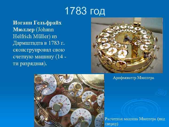 1783 год Иоганн Гельфрайх Мюллер (Johann Helfrich Müller) из Дармштадта в 1783 г. сконструировал свою счетную машину (14 - ти разрядная). Арифмометр Мюллера Расчетная машина Мюллера (вид сверху)