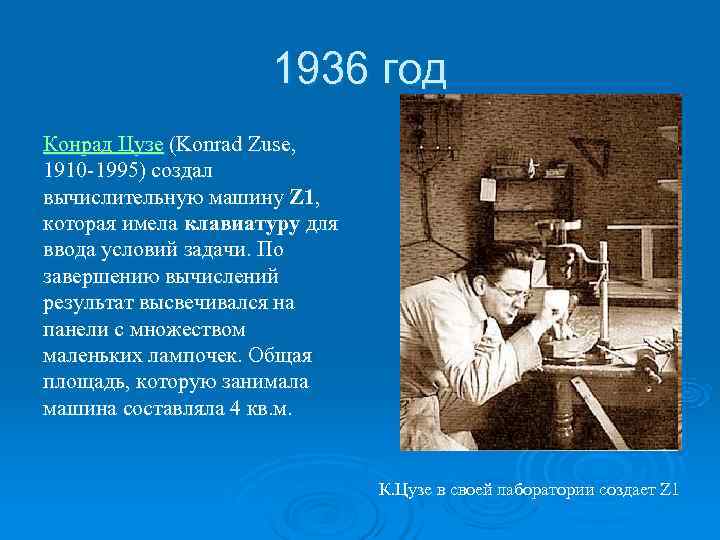 1936 год Конрад Цузе (Konrad Zuse, 1910 -1995) создал вычислительную машину Z 1, которая имела клавиатуру для ввода условий задачи. По завершению вычислений результат высвечивался на панели с множеством маленьких лампочек. Общая площадь, которую занимала машина составляла 4 кв. м. К. Цузе в своей лаборатории создает Z 1