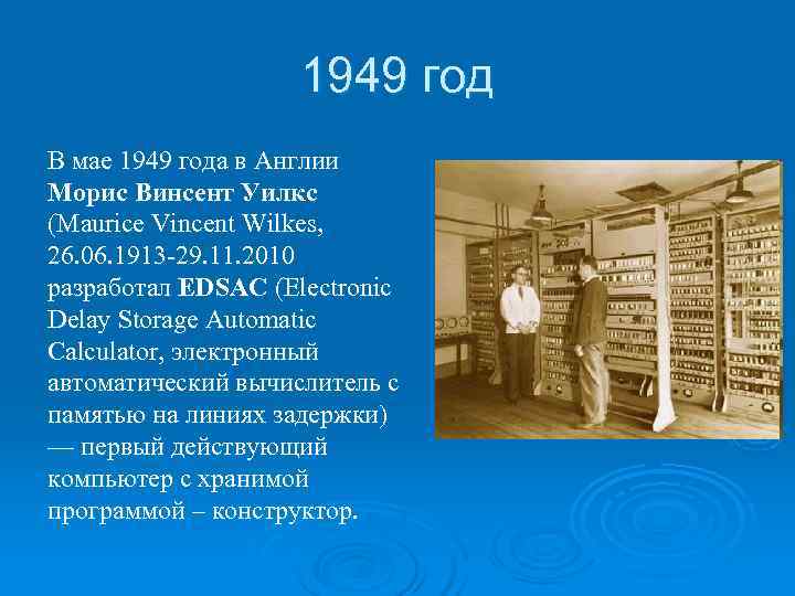 1949 год В мае 1949 года в Англии Морис Винсент Уилкс (Maurice Vincent Wilkes, 26. 06. 1913 -29. 11. 2010 разработал EDSAC (Electronic Delay Storage Automatic Calculator, электронный автоматический вычислитель с памятью на линиях задержки) — первый действующий компьютер с хранимой программой – конструктор.