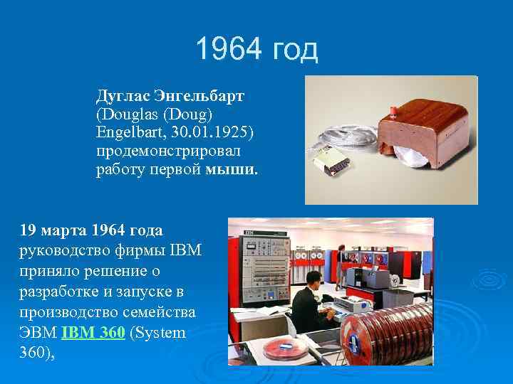 1964 год Дуглас Энгельбарт (Douglas (Doug) Engelbart, 30. 01. 1925) продемонстрировал работу первой мыши. 19 марта 1964 года руководство фирмы IBM приняло решение о разработке и запуске в производство семейства ЭВМ IBM 360 (System 360),