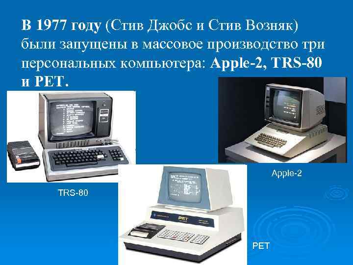 В 1977 году (Стив Джобс и Стив Возняк) были запущены в массовое производство три персональных компьютера: Apple-2, TRS-80 и PET. Apple-2 TRS-80 PET