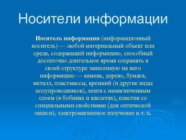 Носители информации Носитель информации (информационный носитель) — любой материальный объект или среда, содержащий информацию, способный достаточно длительное время сохранять в своей структуре занесенную на него информацию — камень, дерево, бумага, металл, пластмассы, кремний (и другие виды полупроводников), лента с намагниченным слоем (в бобинах и кассетах), пластик со специальными свойствами (для оптической записи), электромагнитное излучение и т. п.