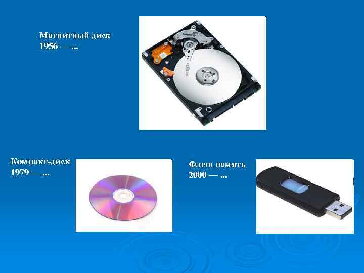 Магнитный диск 1956 —. . . Компакт-диск Флеш память 1979 —. . . 2000 —. . .