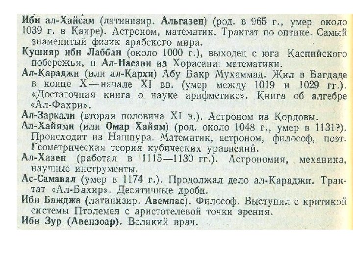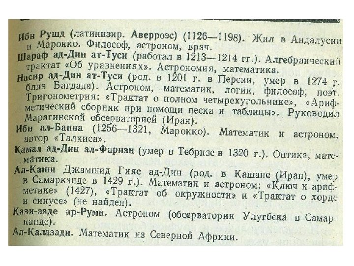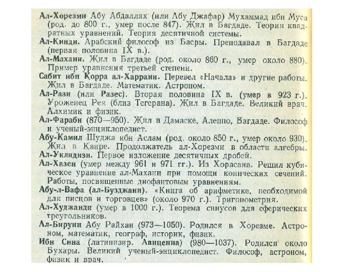 Абу Адаллах Мухаммад ибн Муса ал Маджуси ал-Хорезми Конец VIII века – около 850 v. Книга об индийской арифметике (Книга об индийском счете) v. Краткая книга об исчислении ал-джебр и ал-мукабалы v. Астрономические таблицы (зидж) v. Книга картин Земли v. Книга о построении астролябии v. Книга о действиях с помощью астролябии v. Книга о солнечных часах v. Трактат об определении эры евреев и их праздниках v. Книга истории