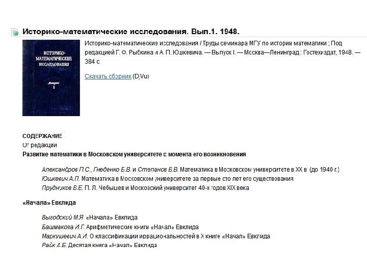 v. Алимов Н. Г. Величина и отношение у Евклида. Историко-математические исследования, вып. 8, 1955, с. 573— 619. v. Башмакова И. Г. Арифметические книги «Начал» Евклида. Историкоматематические исследования, вып. 1, 1948, с. 296— 328. . v. Выгодский М. Я. «Начала» Евклида. Историко-математические исследования, вып. 1, 1948, с. 217— 295. v. Каган В. Ф. Евклид, его продолжатели и комментаторы. В кн. : Каган В. Ф. Основания геометрии. Ч. 1. М. , 1949, с. 28 -110. http: //centant. spbu. ru/plat/proklos/works/28 euklid. htm