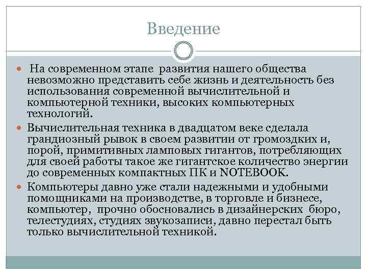 Введение На современном этапе развития нашего общества невозможно представить себе жизнь и деятельность без использования современной вычислительной и компьютерной техники, высоких компьютерных технологий. Вычислительная техника в двадцатом веке сделала грандиозный рывок в своем развитии от громоздких и, порой, примитивных ламповых гигантов, потребляющих для своей работы такое же гигантское количество энергии до современных компактных ПК и NOTEBOOK. Компьютеры давно уже стали надежными и удобными помощниками на производстве, в торговле и бизнесе, компьютер, прочно обосновались в дизайнерских бюро, телестудиях, студиях звукозаписи, давно перестал быть только вычислительной техникой.