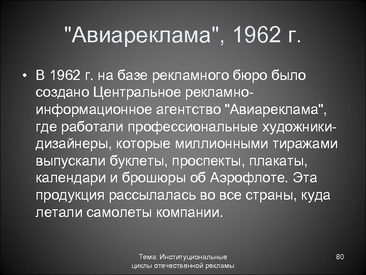 Рекламно информационное бюро Аэрофлота. 1960 г. • В 1960 г. при ГУГВФ было создано Рекламно информационное бюро Аэрофлота. Тогда же родился знаменитый советский слоган "Летайте самолетами Аэрофлота". • Через два года, в 1962 г. на базе рекламного бюро было создано Центральное рекламно информационное агентство "Авиареклама", где работали профессиональные художники дизайнеры, которые миллионными тиражами выпускали буклеты, проспекты, плакаты, календари и брошюры об Аэрофлоте. Эта продукция рассылалась во все страны, куда летали самолеты компании. Тема: Институциональные циклы отечественной рекламы 79