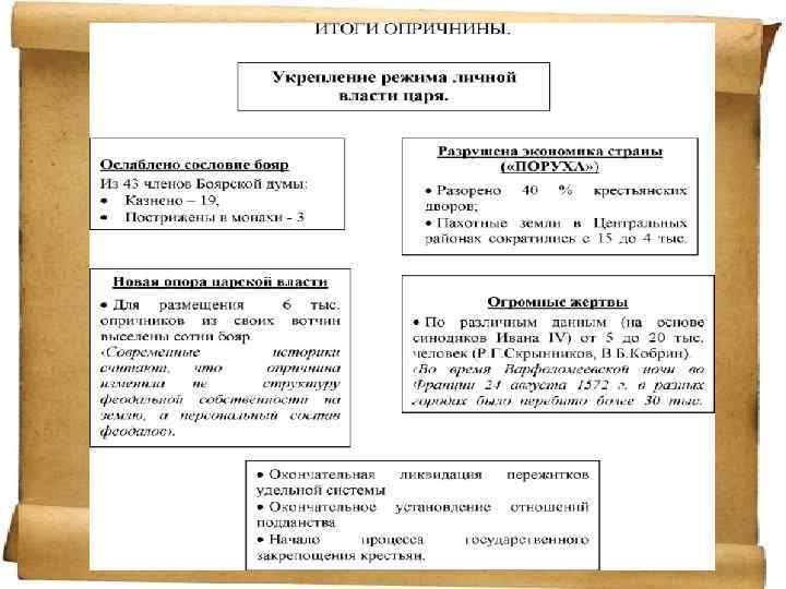 ПРИЧИНЫ ОПРИЧНИНЫ 1. Противоборство царя с окружением, вызванное становлением самодержавия, оттеснением от власти княжеско-боярской знати. 2. Неудовлетворённость царя результатом проводимой внешней политики (ходом Ливонской войны).