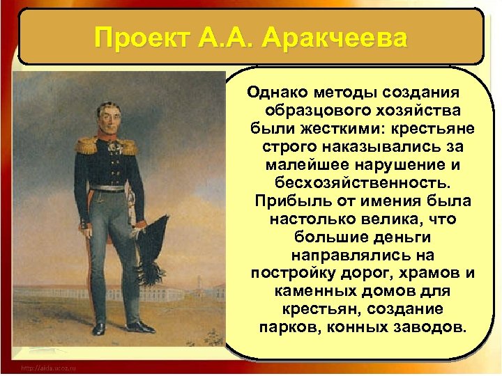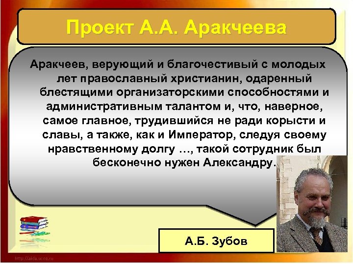 Проект А. А. Аракчеева Аракчеев, верующий и благочестивый с молодых лет православный христианин, одаренный блестящими организаторскими способностями и административным талантом и, что, наверное, самое главное, трудившийся не ради корысти и славы, а также, как и Император, следуя своему нравственному долгу …, такой сотрудник был бесконечно нужен Александру. А. Б. Зубов