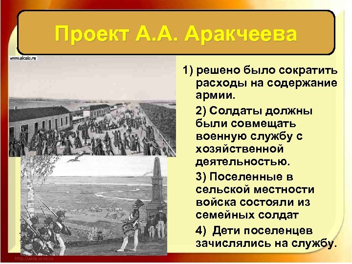 Проект А. А. Аракчеева 1) решено было сократить расходы на содержание армии. 2) Солдаты должны были совмещать военную службу с хозяйственной деятельностью. 3) Поселенные в сельской местности войска состояли из семейных солдат 4) Дети поселенцев зачислялись на службу.