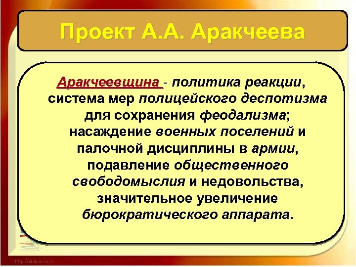 Проект А. А. Аракчеева Аракчеевщина - политика реакции, система мер полицейского деспотизма для сохранения феодализма; насаждение военных поселений и палочной дисциплины в армии, подавление общественного свободомыслия и недовольства, значительное увеличение бюрократического аппарата.