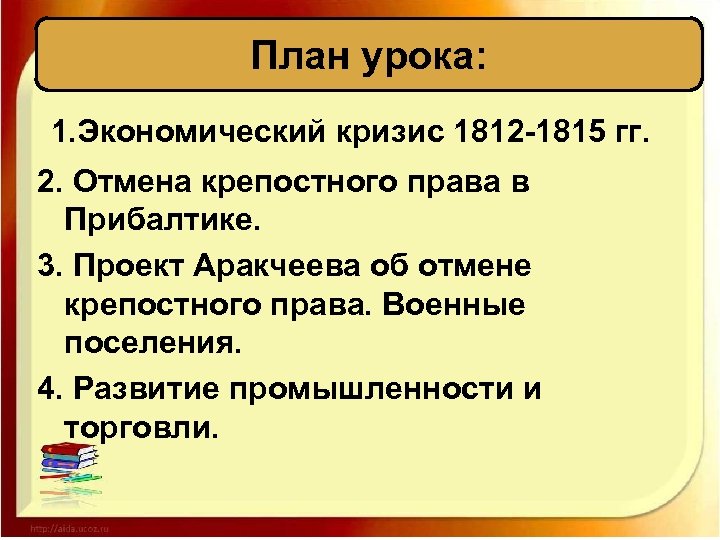 План урока: 1. Экономический кризис 1812 -1815 гг. 2. Отмена крепостного права в Прибалтике. 3. Проект Аракчеева об отмене крепостного права. Военные поселения. 4. Развитие промышленности и торговли.