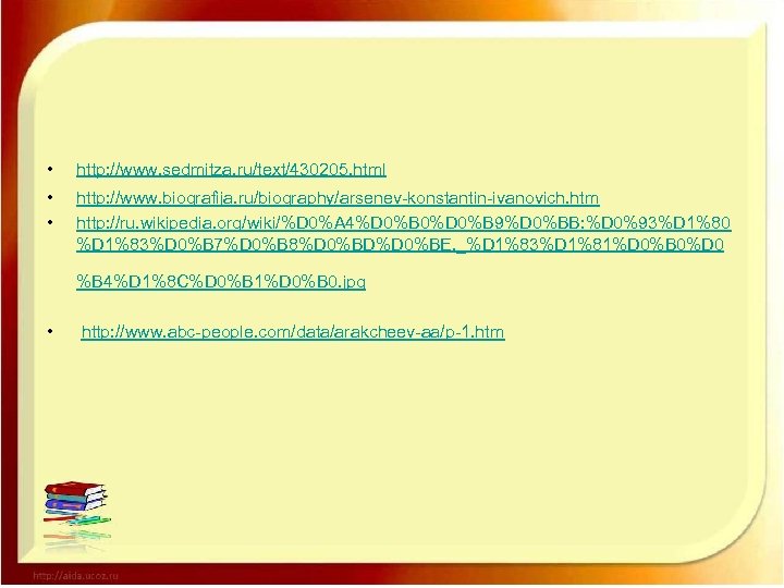• http: //www. sedmitza. ru/text/430205. html • • http: //www. biografija. ru/biography/arsenev-konstantin-ivanovich. htm http: //ru. wikipedia. org/wiki/%D 0%A 4%D 0%B 0%D 0%B 9%D 0%BB: %D 0%93%D 1%80 %D 1%83%D 0%B 7%D 0%B 8%D 0%BD%D 0%BE, _%D 1%83%D 1%81%D 0%B 0%D 0 %B 4%D 1%8 C%D 0%B 1%D 0%B 0. jpg • http: //www. abc-people. com/data/arakcheev-aa/p-1. htm