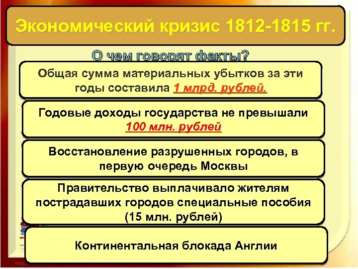 Экономический кризис 1812 -1815 гг. О чем говорят факты? Общая сумма материальных убытков за эти годы составила 1 млрд. рублей. Годовые доходы государства не превышали 100 млн. рублей Восстановление разрушенных городов, в первую очередь Москвы Правительство выплачивало жителям пострадавших городов специальные пособия (15 млн. рублей) Континентальная блокада Англии