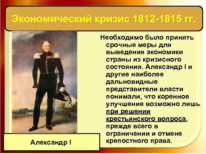 Экономический кризис 1812 -1815 гг. Александр I Необходимо было принять срочные меры для выведения экономики страны из кризисного состояния. Александр I и другие наиболее дальновидные представители власти понимали, что коренное улучшение возможно лишь при решении крестьянского вопроса, крестьянского вопроса прежде всего в ограничении и отмене крепостного права.