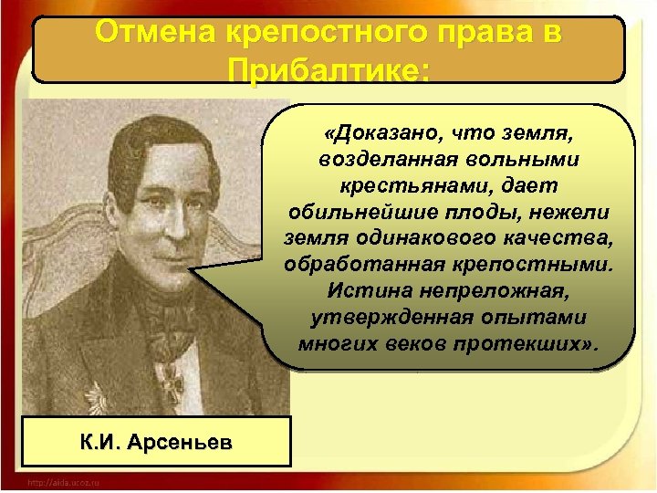 Отмена крепостного права в Прибалтике: «Доказано, что земля, возделанная вольными крестьянами, дает обильнейшие плоды, нежели земля одинакового качества, обработанная крепостными. Истина непреложная, утвержденная опытами многих веков протекших» . К. И. Арсеньев