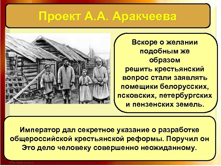 Проект А. А. Аракчеева Вскоре о желании подобным же образом решить крестьянский вопрос стали заявлять помещики белорусских, псковских, петербургских и пензенских земель. Император дал секретное указание о разработке общероссийской крестьянской реформы. Поручил он Это дело человеку совершенно неожиданному.