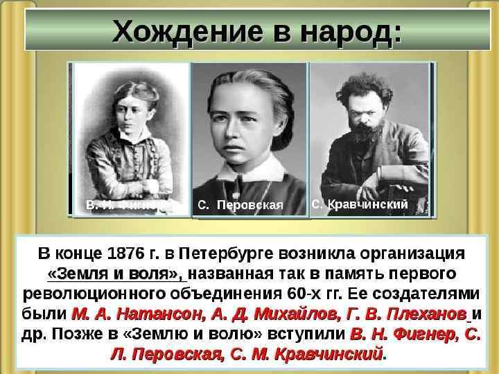 1879 г. раскол «Земли и воли» на «Народная воля» А. И. Желябов С. Л. Перовская «Черный передел» Г. В. Плеханов В. И. Засулич