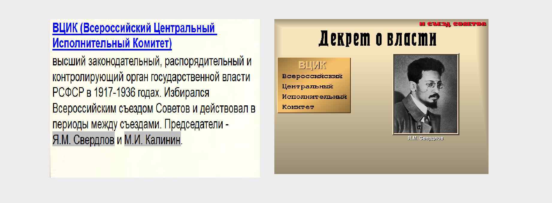 Каменев. Лев Борисович 1917 Свердлов. Яков Михайлович 1917 -1919 Калинин Михаил Иванович 1919 — 1938 Всероссийский Центральный Исполнительный Комитет ( ВЦИК) — высший законодательный и распорядительный орган советской власти в 1917— 1938 г. Избирался Cъездом Советов и действовал в периоды между съездами.