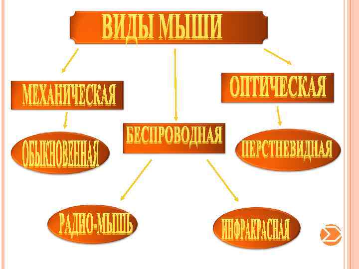 Обыкновенная Связана с ПК кабелем, устройством на инфракрасных лучах. Вращение шарика регистрируется двумя стержнями, на которых светодиоды, фоторезистор. Информация передаётся по кабелю. Беспроводная Появилась в середине 90 -х гг. Используется инфракрасный луч. Приёмник сигналов подключается к портам PS/2, USB, COM. В мыши устанавливается передатчик, транслирующий сигналы. Недостаток- увеличенная масса, низкая частота /быстродействие/. Оптическая Ролики замены оптическим датчиком, раньше требовался специальный коврик. Работа светодиодом, современная технология разработана в 1999 г. Используют минивидеокамеру, подающую сигналы в цифровой процессор мыши. При перемещении мыши процессор анализирует изменение картинки, передаёт их в ПК, определяет направление указателя. Скорость 1500 снимков в секунду. Есть подсветка. Процессор мыши выполняет 18 млн. операций в секунду.