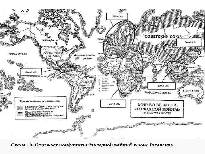 Спайкмен – отец атлантизма Поэтому его можно назвать “отцом атлантизма”(сложное геополитическое понятие, объединяющее западный атлантичекий сектор человеческой цивилизации, совпадающий в военно-стратегическом отношении с блоком НАТО, «архитектором» которого не без оснований тоже называют Н. Спайкмена. Конечно, Римленд, а через него весь мир должен находиться под контролем США. Для чего США, как главная океаническая ядерная держава с помощью военно-морских сил и авиации должны обеспечить свое присутствие на военно-морских базах по всему транс-атлантическому, транс-тихоокеанскому побережьям и в Северном Ледовитом океане (для этого потребовалась Норвегия). Советский Союз, понимая геополитическую важность Римленда, в течение многих лет стремился не уступить США. В контексте этой борьбы можно рассматривать войну между Северной и Южной Кореей (1953 г. ), Ближневосточное противостояние 50 -70 -х годов, войну во Вьетнаме (Схема).