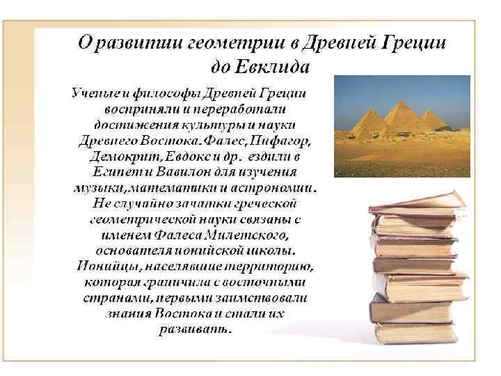 я ука, изучающа а Геометрия- н е еры и взаимно. формы, разм ических фигур р ожение геомет распол лась в связи с а никла и развив Она воз практической отребностями п х века. С древни о тельности чел дея с сталкивались времён люди ью находить необходимост предметами, у стояния межд рас стков земли, а ть размеры уч определя асположению ор тироваться п ореин и. О зарождени п д на небе и т. звёз Египте около ем етрии в Древн геом 00 лет до н. э. 20
