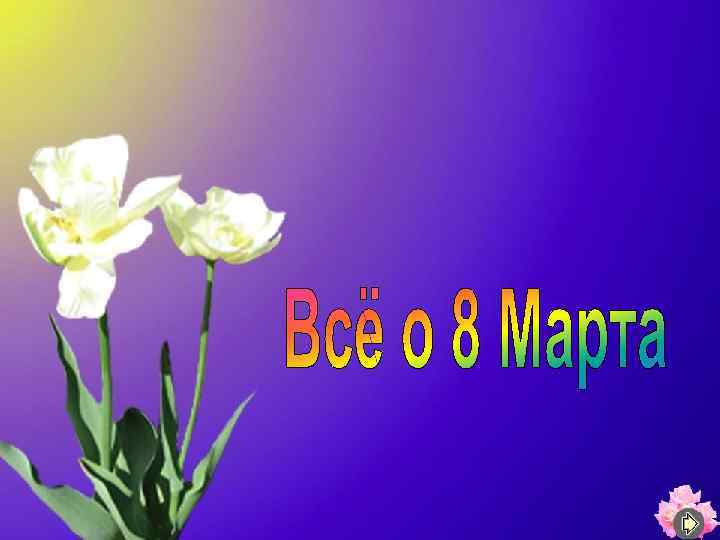 Ресурсы Интернета: http: //33 b. ru http: //www. rian. ru http: //www. arsvest. ru/archive/issue 677/posidelki/view 8672. html http: //www. istorya. ru/articles/8 marta. php http: //newyear. sachkov. ru/script/8 mart 44. html http: //newyear. sachkov. ru/script/8 mart 45. html http: //newyear. sachkov. ru/script/8 mart 47. html http: //www. prazdnuem. ru/holidays/8 marta/8 march. phtml http: //www. podrobnosti. ua/culture/traditions/2006/03/07/293273. html http: //www. podarok. ru/prazdnik/8 mart. aspx http: //www. podarok. ru/prazdnik/8 mart 3. aspx http: //scenarist. boom. ru/vecher. html С праздником весенним!