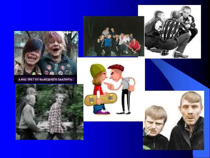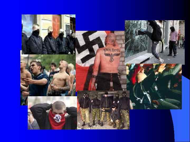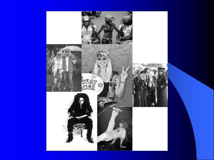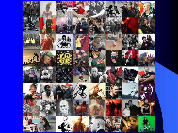 Субкультуры начала ХХI века l l l - «золотая молодежь» в столицах; - наркоманская субкультура; - уголовная среда; - «голубая» тусовка; - неофашисты и скинхеды; - «нацболы» (национал-большевики); - футбольные фанаты; - «попсовики» ; - «старая контркультура» (субкультура, развивающая традиции хиппи 60 -х годов. ); - сатанисты; - «новая контркультура» (оппозиционная молодежная субкультура, соединившая традиции старых хиппи, национал-большевизма и левацкого революционизма)
