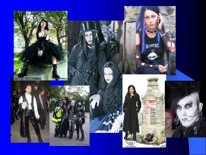 Готы. Одеваются они во все черное, в крайнем случае в темно-серое. Прическа гота – настоящее произведение искусства. Парни-готы, как правило, андрогинны. Из предметов обихода приветствуются кожаные штаны, жилетки, бусы, цепочки, серьги. Многие готы носят древнеегипетские символы – «анки» (анкх – крест с петлей; египтяне использовали его как символ бессмертия, жизни, соединения мужского и женского начал; готы интерпретировали анкх в качестве символа загробной жизни). Традиционно среди них обращение к готическому роману – от Уолпола до Шелли; почитаются также Камю, Кафка, поздний Тургенев и прочие «сильно перепуганные гении» . Слушают, соответственно, готический рок (“Joy Division”, “Cure”, “Bauhaus”, “H. I. M”, “Evanescence”). Настоящие готы, помимо забот об одежде, стремятся поддерживать и соответствующий образ жизни. Готы обильно и охотно заимствуют декадентскую, кладбищенскую, вампирическую эстетику. Приветствуется все, что относится к темной стороне бытия, связано со смертью. Излюбленные места сборищ готов – кладбища. Часто практикуют садомазохизм. Готы склонны превращать свои тусовки в ролевую игру, в некий инфернальный театр, но несхожий с игрищами фанатов Толкиена.