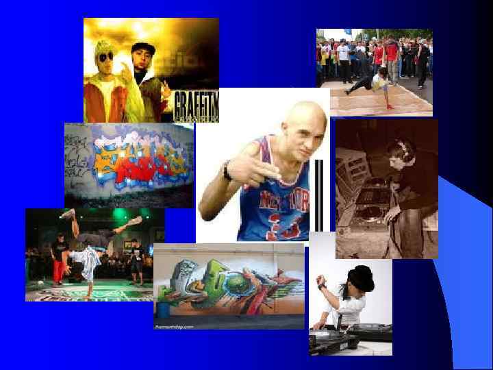 l l l Брейк – это танцевальный компонент данной субкультуры, включающий в себя элементы акробатики и пантомимы. Граффити – своеобразная, легкоузнаваемая роспись, сделанная с помощью красок, распыляемых из баллончиков, с почти обязательным присутствием текста. Ди-джеинг – это музыкальное сопровождение для рэпа и брейка, хотя, конечно, ди-джеинг может существовать и отдельно. Ди-джеи создают как свои записи, так и используют чужие, «вырезая» кусочки записей (сэмплы) и вставляя их в свои композиции.