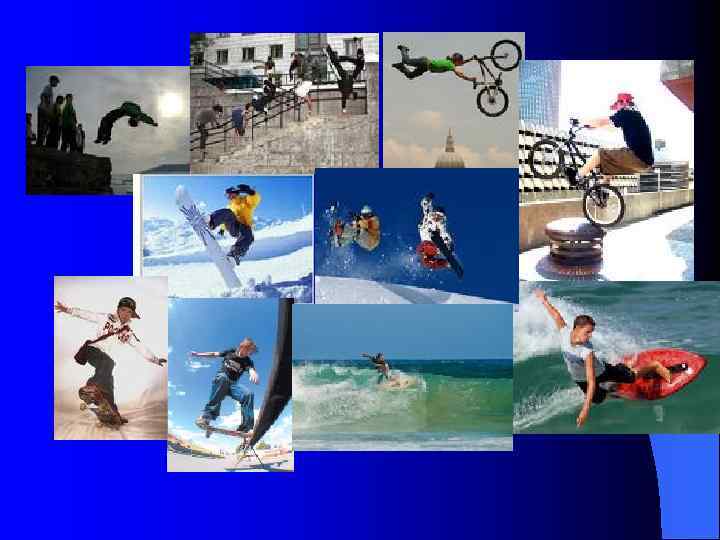 Наравне с увлечением роликовыми коньками последователи хип-хопа пустились и на другие экстремальные эксперименты, связанные с получением свежих порциях адреналина в крови. Возникло целое движение экстремалов, к которым относятся скейтбордисты (катание на роликовых досках), bmx (горный велосипед, или маунтинбайк), сноубордисты (катание с гор на досках), серферы (плавание на досках), трейсеры (бег с преодолением естественных препятствий) и другие. Главное для экстремалов – не достижение определенных результатов, а острота ощущений.