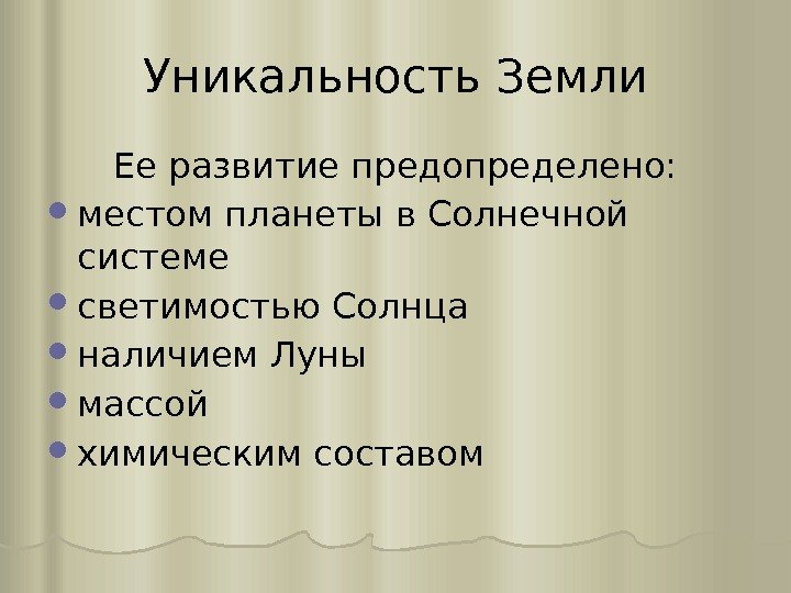 Уникальность Земли Ее развитие предопределено: местом планеты в Солнечной системе светимостью Солнца наличием Луны массой химическим составом