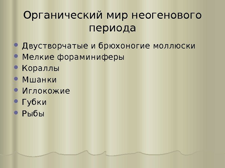 Органический мир неогенового периода Двустворчатые и брюхоногие моллюски Мелкие фораминиферы Кораллы Мшанки Иглокожие Губки Рыбы