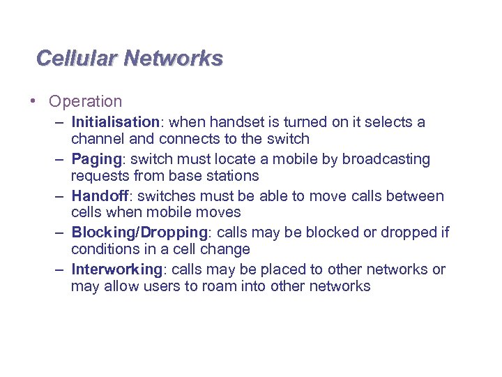 Cellular Networks • Operation – Initialisation: when handset is turned on it selects a channel and connects to the switch – Paging: switch must locate a mobile by broadcasting requests from base stations – Handoff: switches must be able to move calls between cells when mobile moves – Blocking/Dropping: calls may be blocked or dropped if conditions in a cell change – Interworking: calls may be placed to other networks or may allow users to roam into other networks
