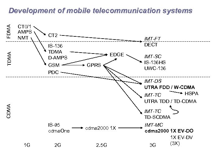 CT 0/1 AMPS NMT CT 2 IS-136 TDMA D-AMPS GSM PDC TDMA FDMA Development of mobile telecommunication systems IMT-FT DECT EDGE GPRS IMT-SC IS-136 HS UWC-136 IMT-DS UTRA FDD / W-CDMA HSPA IMT-TC CDMA UTRA TDD / TD-CDMA IMT-TC TD-SCDMA IS-95 cdma. One 1 G cdma 2000 1 X 2 G 2. 5 G IMT-MC cdma 2000 1 X EV-DO 1 X EV-DV (3 X) 3 G