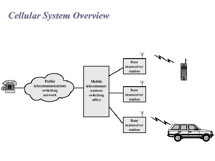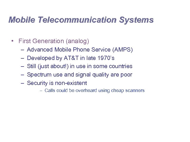 Mobile Telecommunication Systems • First Generation (analog) – – – Advanced Mobile Phone Service (AMPS) Developed by AT&T in late 1970’s Still (just about!) in use in some countries Spectrum use and signal quality are poor Security is non-existent – Calls could be overheard using cheap scanners