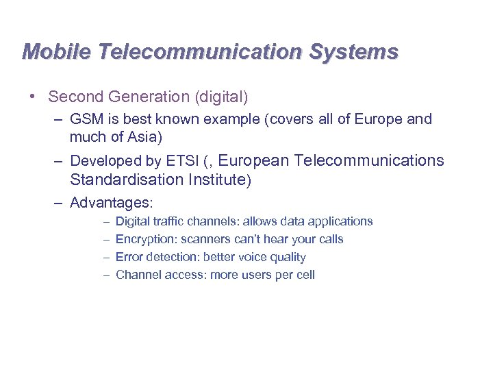 Mobile Telecommunication Systems • Second Generation (digital) – GSM is best known example (covers all of Europe and much of Asia) – Developed by ETSI (, European Telecommunications Standardisation Institute) – Advantages: – – Digital traffic channels: allows data applications Encryption: scanners can’t hear your calls Error detection: better voice quality Channel access: more users per cell